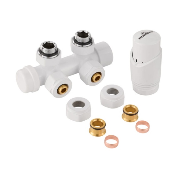 ZESTAW TERMOSTATYCZNY DO GRZEJNIKA, ZESPOLONY KĄTOWY BIAŁY R 1/2", 16 PEX / 15 Cu